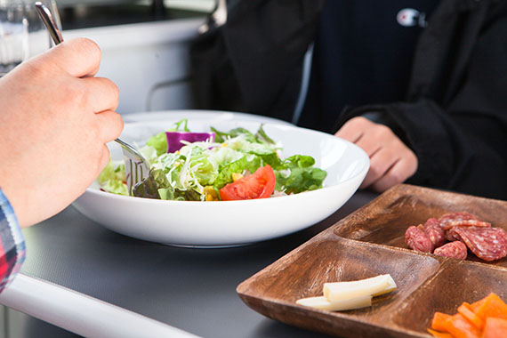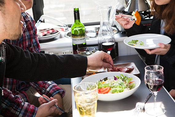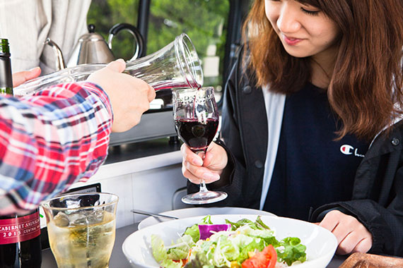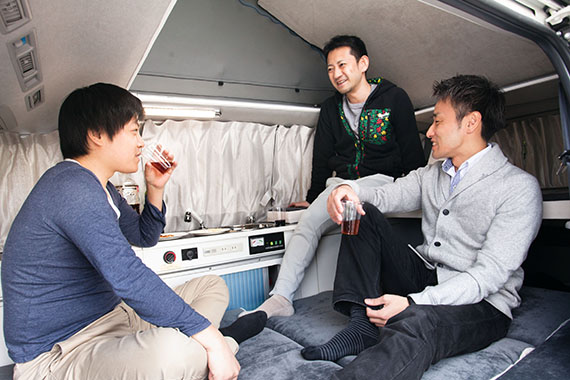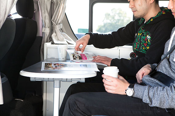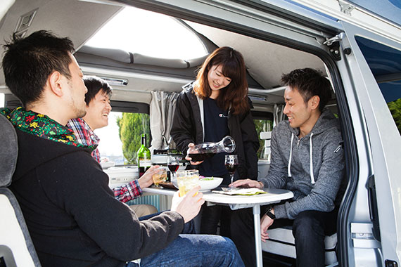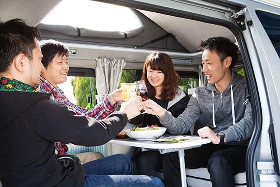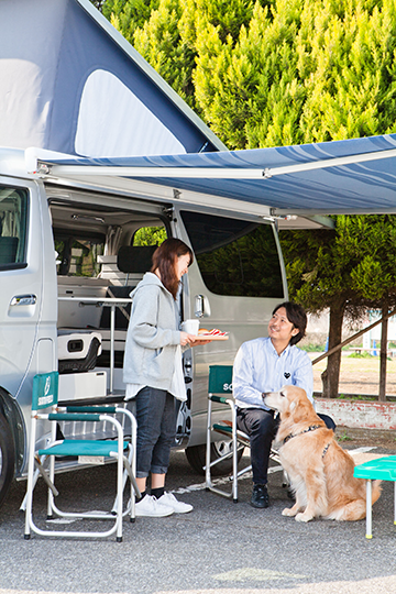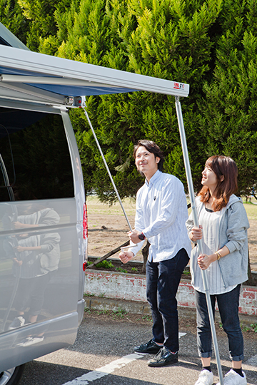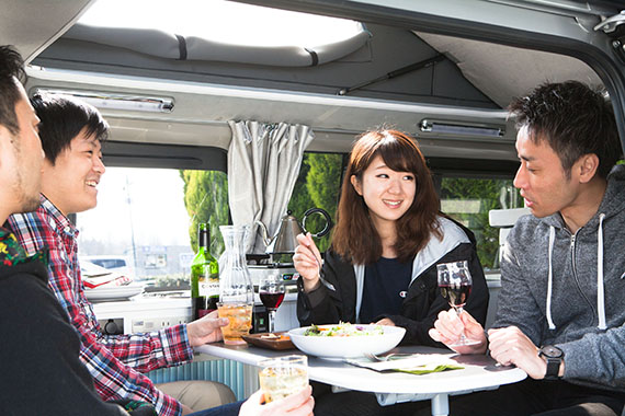 簡単に車内で食事・就寝可能。車体サイドのオーニングテントを張ればいつでも日陰の休憩所