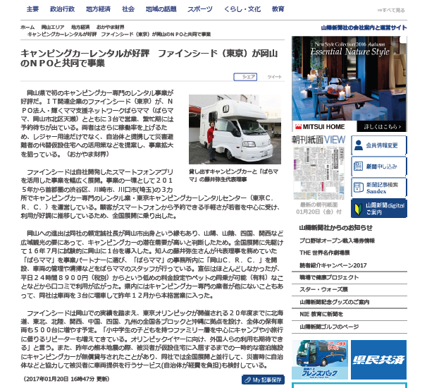 1/20 岡山「山陽新聞digital」に東京C.R.C.が掲載されました2017年01月20日 「山陽新聞digital」に、キャンピングカー専門のサービスが拡大していることを受けて、「山陽新聞digital」がNPO法人輝くママ支援ネットワークぱらママ(ぱらママ、岡山市北区天瀬)との協業に関する記事を掲載。 岡山で一番人気の、マツダ ボンゴトラック「 アミティ4WD」を撮影していただきました。