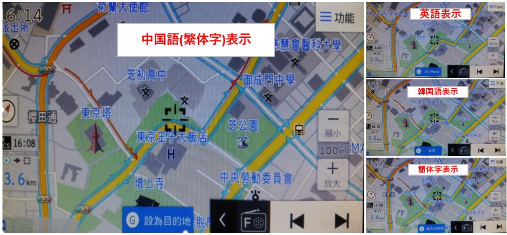 ・多言語対応の地図画面(英語、韓国語、中国語(繁体字・簡体字)による画面表示)