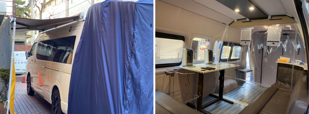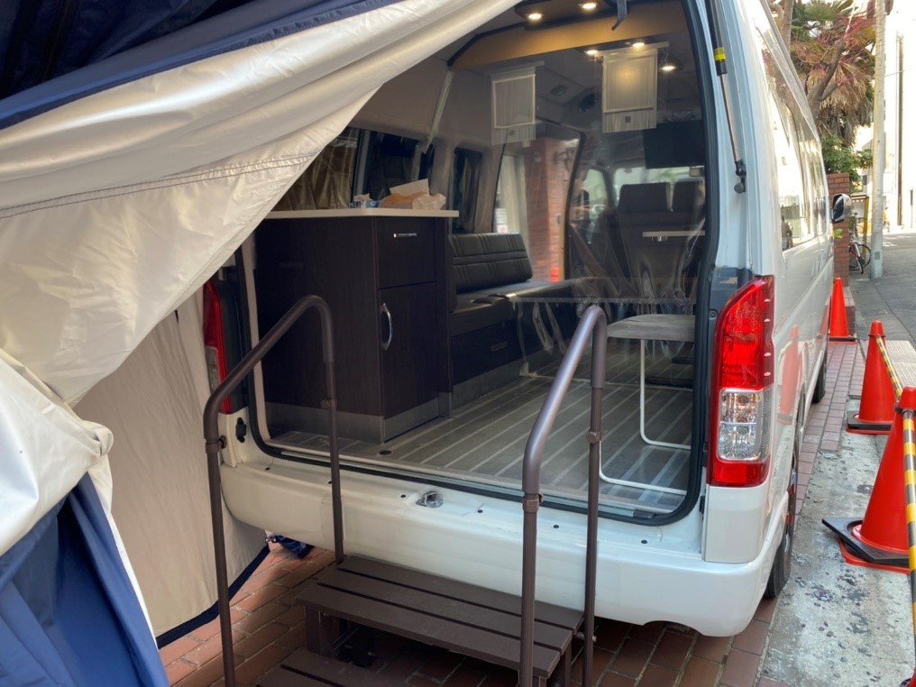 今回導入した車両はJapanCRCのオリジナルキャンピングカー「ロビンソンV95」で、車内で100V電源が使用できる他、エンジンを停止した状態でも使用できる暖房機「FFヒーター」が標準で搭載されているなど、車両単体で医療施設としての代用が可能となります。導入から運用まで時間を要さず、病院側の事情や天候に応じて素早く移動できる利点もあるため、受け入れ先の検査体制や車両の配置ロケーションに応じた運用が可能です。