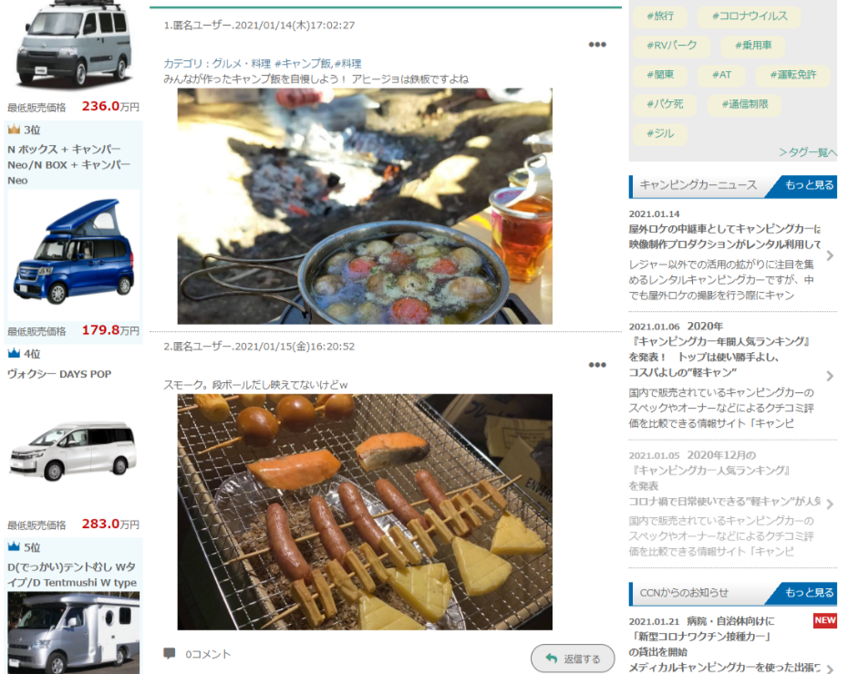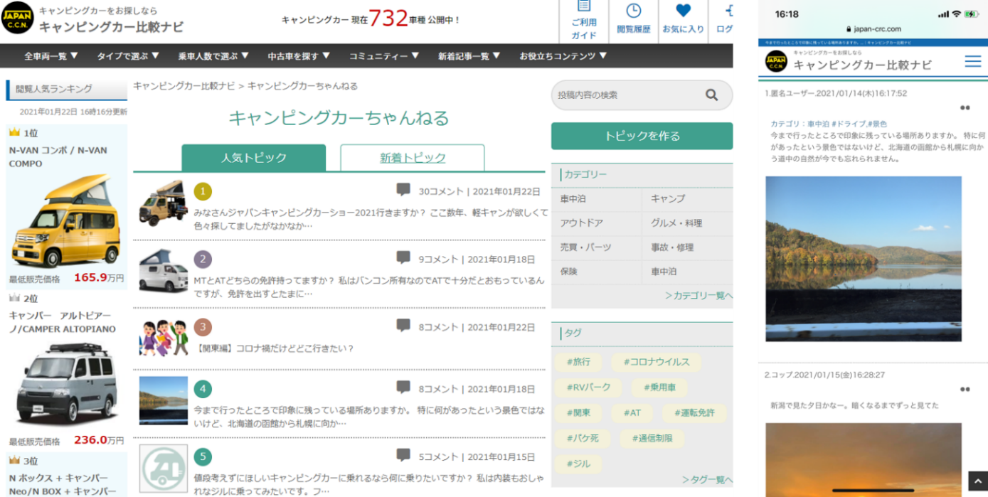 国内で販売されているキャンピングカーのスペックやオーナーなどによるクチコミ評価を比較できる情報サイト「キャンピングカー比較ナビ」を運営するキャンピングカー株式会社(本社:東京都千代田区、代表取締役:頼定 誠)は、同サイト内でキャンピングカー、車中泊、アウトドア、旅行、グルメ・料理、事故、修理など、どんなことでも気軽におしゃべりできる情報交換コミュニティ「キャンピングカーちゃんねる」を2021年1月25日にリリースしたことをお知らせいたします。