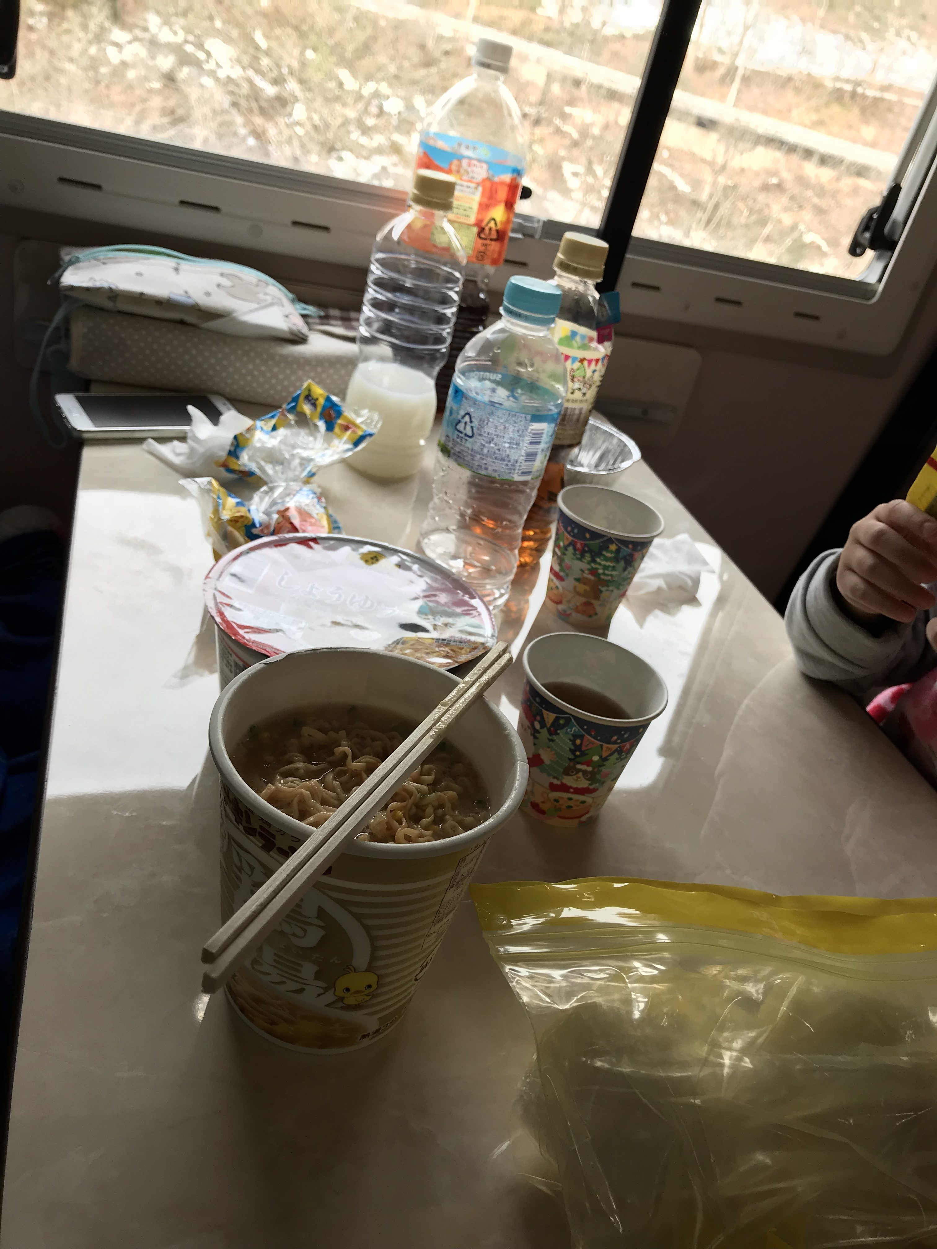 スキー場のランチはいつも席を探すのに苦労しますが、今回はキャンピングカーで昼食です。コンロもあるのでお湯を沸かしてラーメン